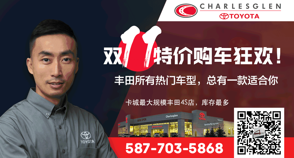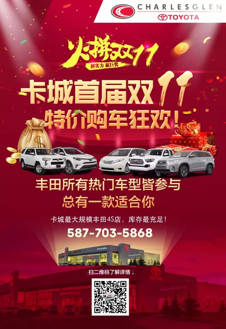 为了广大粉丝的利益,卡尔加里生活联系到加西最大的丰田4S店Charlesglen,在于他们的销售经理商谈中得知,该车行目前还有大量的2017款的车型,并且愿意配合卡尔加里生活为卡城华人举办一次双11疯狂购车节。