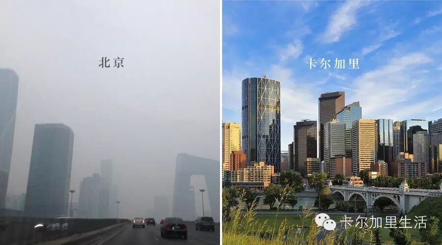 北京的有沙尘暴和雾霾,这是人类活动造成的,而卡尔加里冬天有极端寒冷加暴风雪的恐怖天气。很多人害怕甚至逃离,这些因素起到了推动作用。