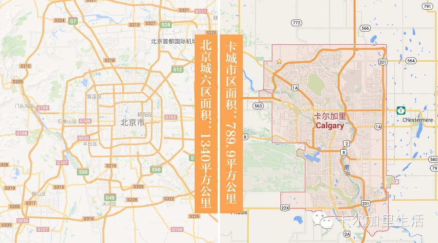 北京五环内面积不到700平方公里,卡尔加里城区面积700多平方公里。但是由于各自发展速度不同,北京建成区面积这几年已经超过卡城较多,城六区的面积是1340平方公里。