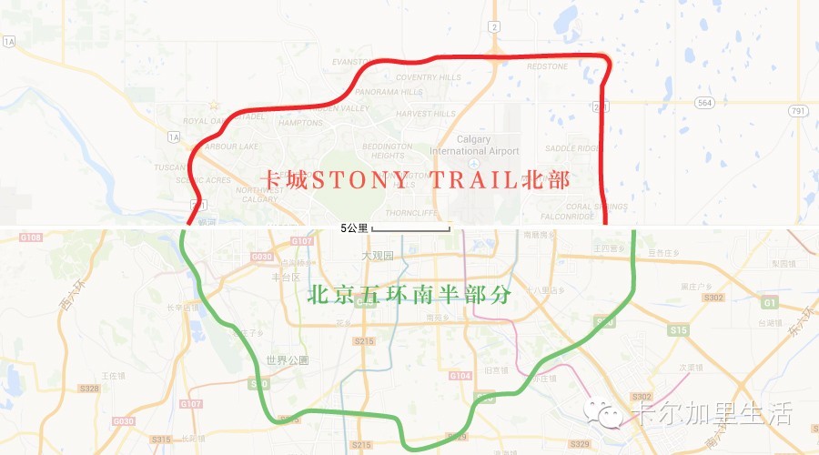 大家都知道北京有五环,一般汽车限号也仅限于五环内,所以大家印象中的五环代表着某种含义的城区分界线作用。而卡尔加里也有一个“五环”-Stoney Trail,Stoney外基本上都是新区。而且,其与北京五环东西宽度基本相同(如下图),当然,由于各种原因,Stoney目前还没有完全形成闭环。