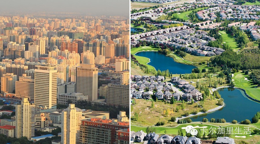 几十倍于卡尔加里的人口,北京人多地少,住宅基本上是各种高层,板楼就很幸福了,别墅那是富豪的待遇。而卡尔加里大部分家庭都住在一两层的联排或者独立屋里。
