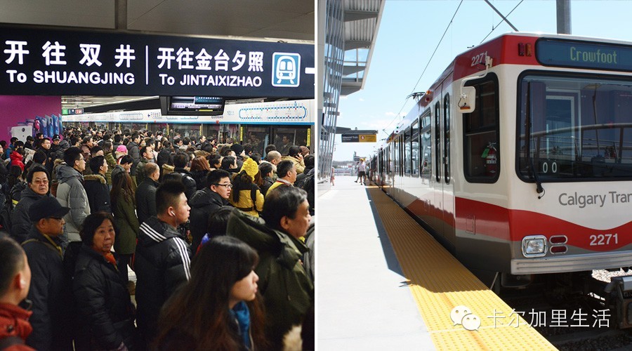 北京,你懂的,如果地铁车厢不挤那真是遇到好时候了。而卡尔加里Ctrain,只要是非上下班高峰时间,站台和车厢里几乎没什么人,基本上有座。到了晚上,人少了还真有点害怕。