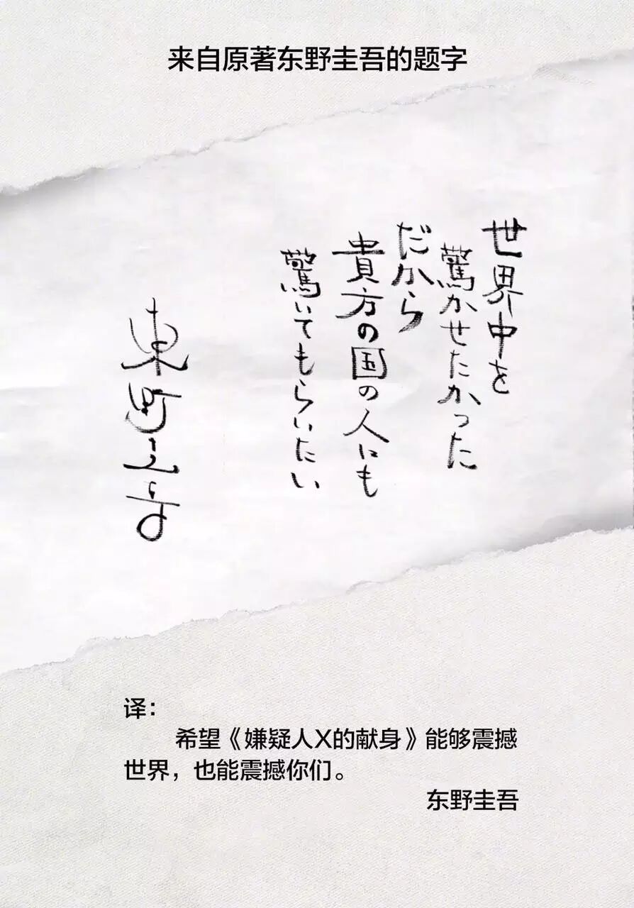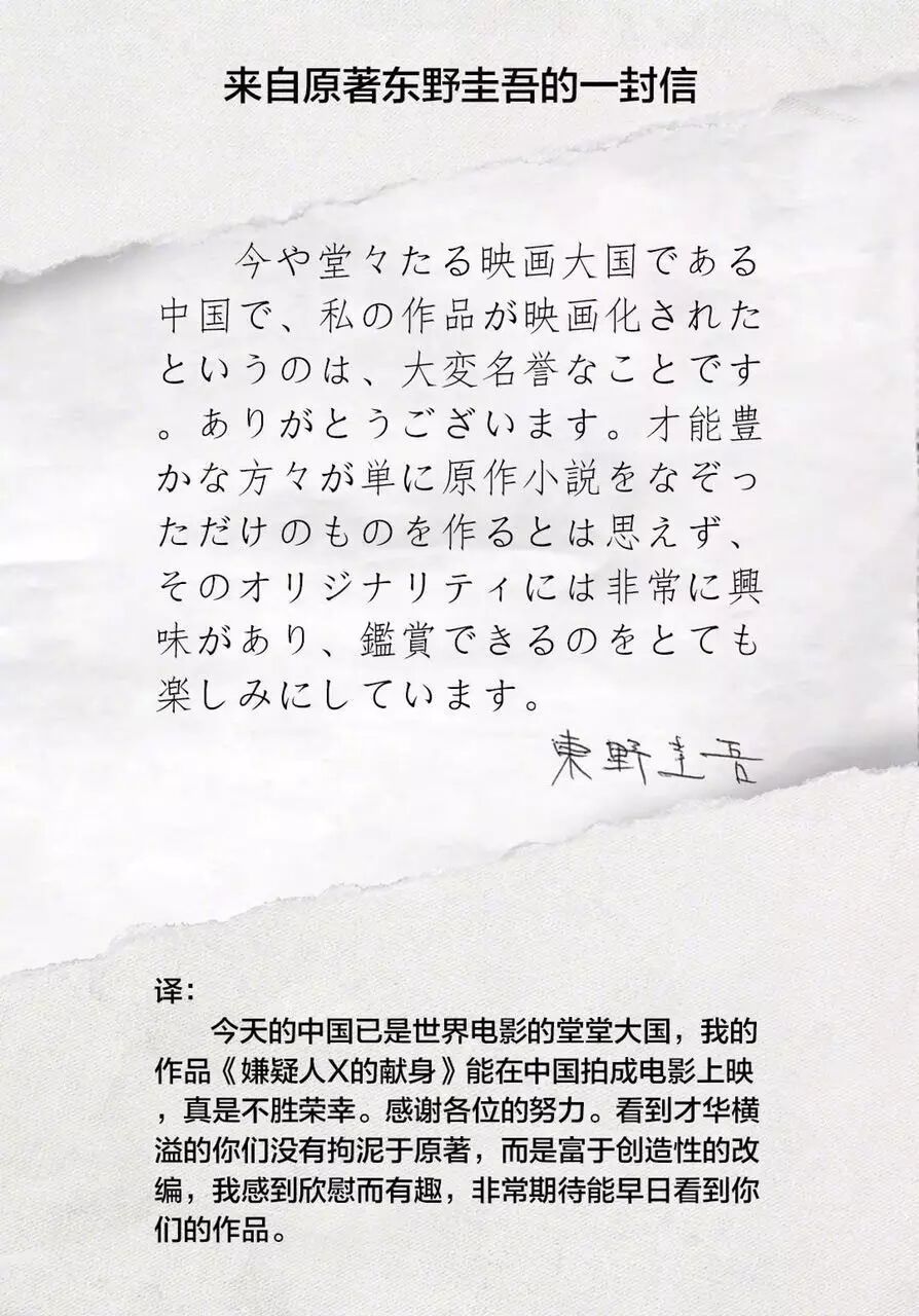 是的,就连东野圭吾本人,也对中国版表达了肯定,并送上了自己的亲笔信。