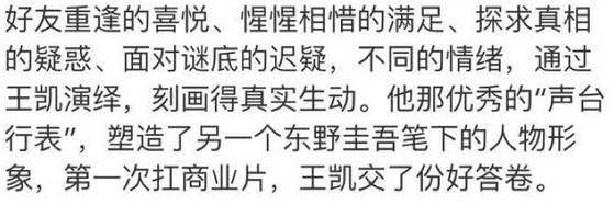 为了这部《嫌疑人X的献身》,苏有朋爆料自己亲自去云南“求”王凯出演。因为当时王凯没档期,而双方又坚持“不轧戏”的原则,他就而足足等了四个月。最后成片里的表现,苏有朋评价为“不可思议的惊喜”。