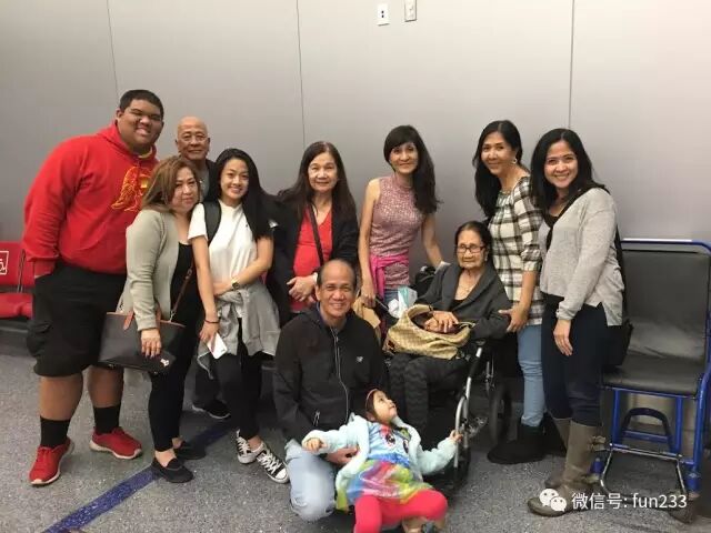 在孩子的陪伴下到洛杉矶与家人团聚。