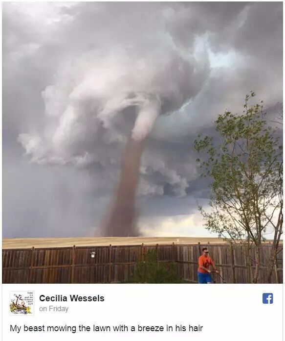 于是Cecilia就出去看了看,Holy shxt! 这么大的龙卷风!再定睛一看,妈呀,老公还在院子里修草!