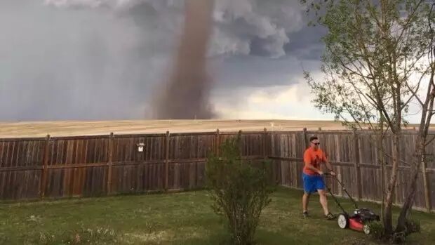 没错!那么大的龙卷风就在身后,老哥还在那里一本正经很认真地修剪草坪。。。