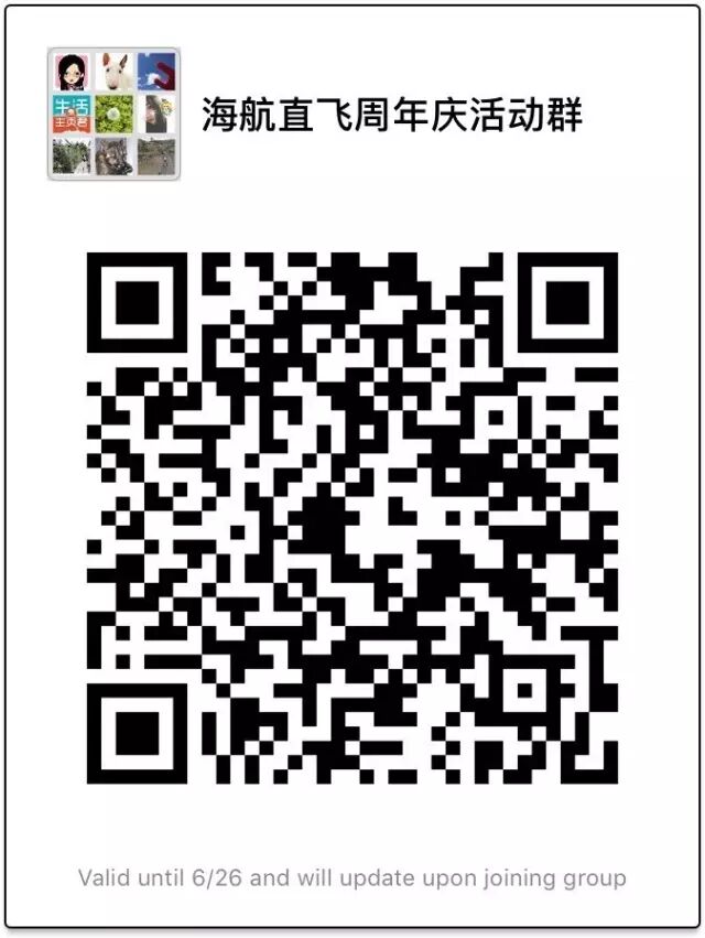 推荐所有参与活动的朋友加入我们“海航周年庆活动群”,方便及时解答和更新信息!!!扫描下方二维码即可入群!!!