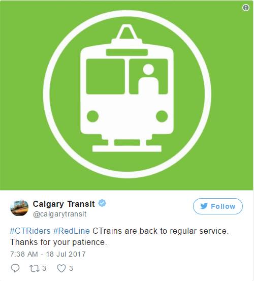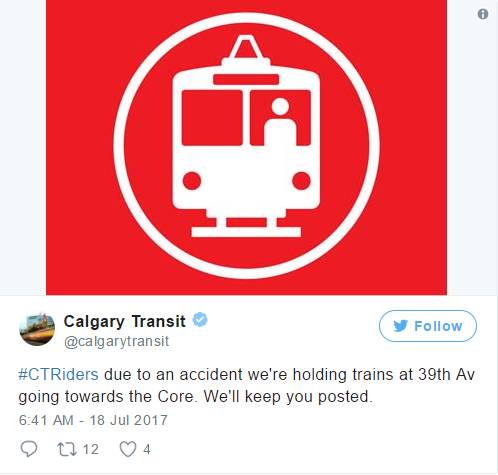 事故发生后, CTrain部分运行路段被迫短暂关闭,交通运输公司派出中转巴士,将乘客运送至39Avenue车站,在这里乘客可以继续搭乘CTrain。稍后,7点40分左右,CTrain运行线路恢复正常,目前这起事故发生的原因还在进一步调查中。