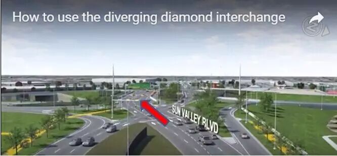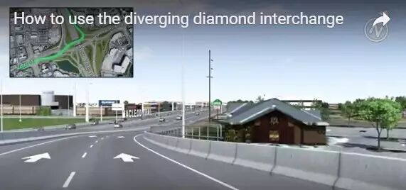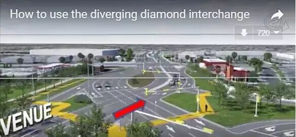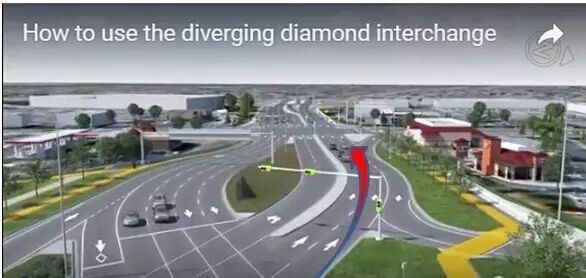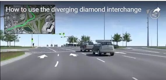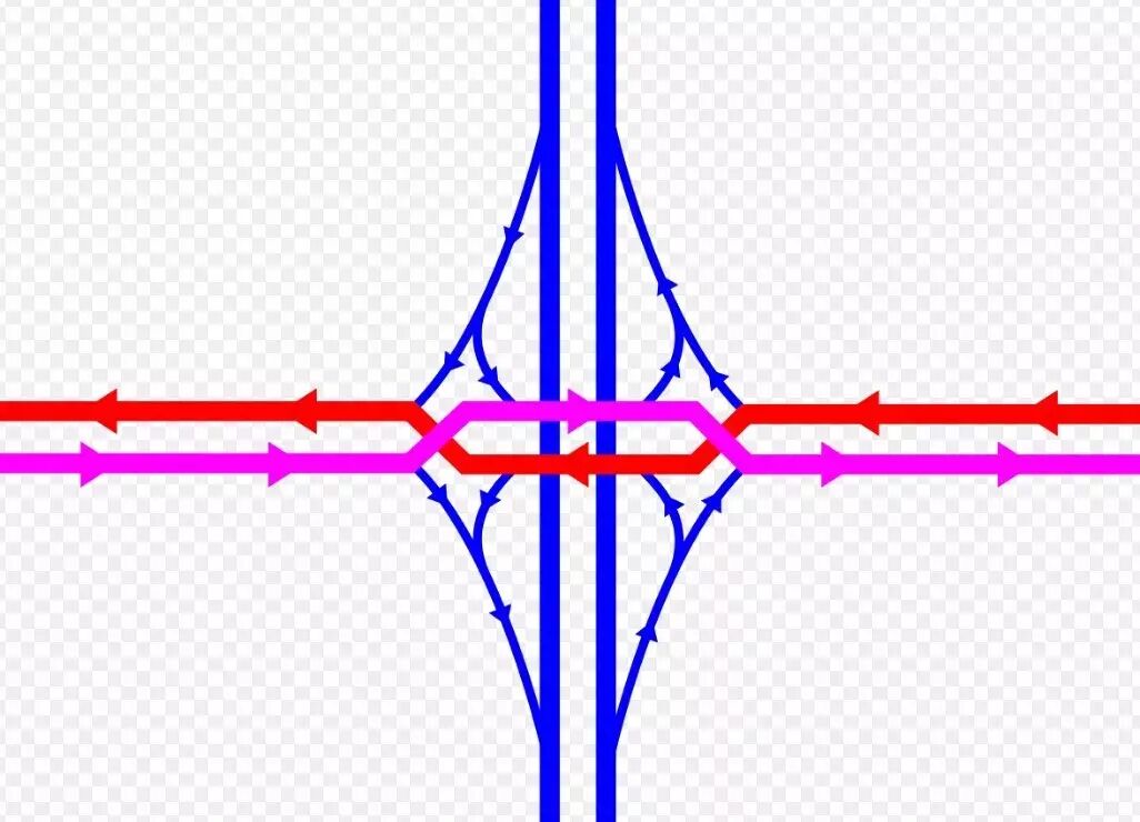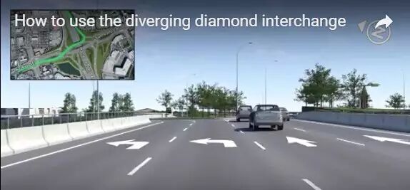 神马叫钻石双向立交桥,这是立交桥(交流道)的一种新形式,模样从空中俯瞰是菱形,所以称其为钻石。下面这图简单概括了钻石双向立交桥的交通行车走向:
