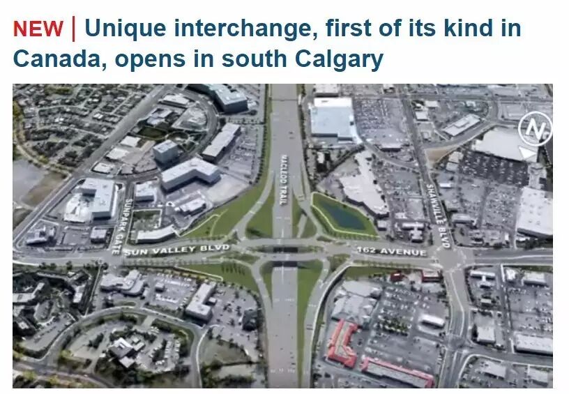 这座新建立交桥,那可不得了了!卡城市政耗费$7800万巨资,耗时2年,在加拿大属于开天辟地之作,是加拿大历史上的第一座钻石双向立交桥(DDI)!