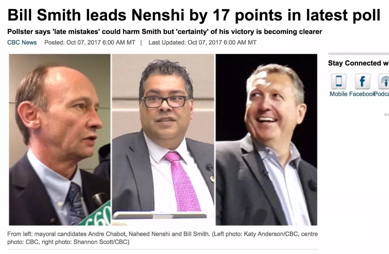 早在10月7日,来自MainStreet的民义调查结果显示,Bill Smith领先Nenshi17个百分点。