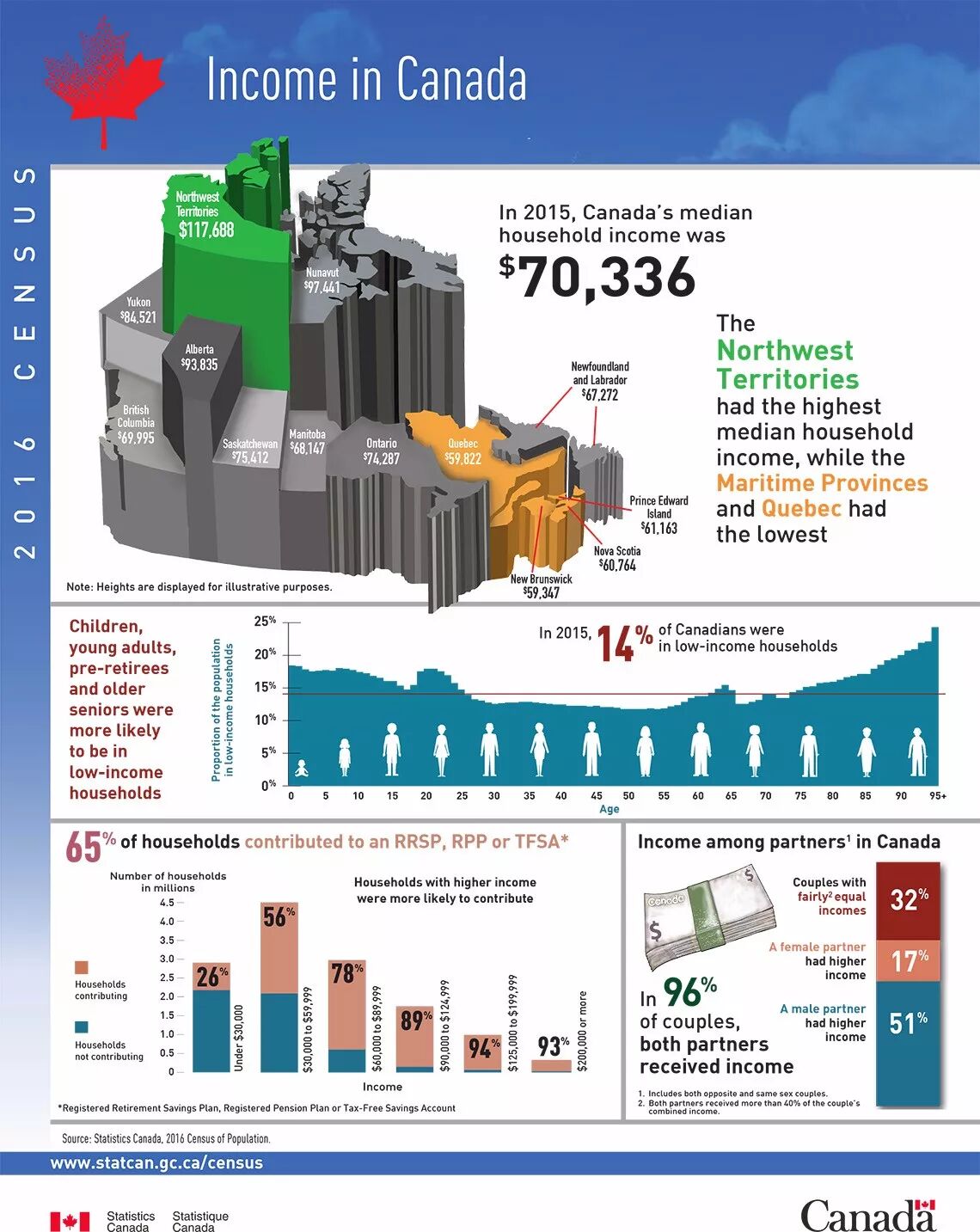 那么在加拿大,中产阶级的情况是怎样的呢?根据最新的人口普查数据显示,2015年加拿大家庭收入中值达到$70,336。这是国家收入阶梯的中间点。