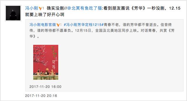 回归之后,《芳华》相较于9月份撤档前的版本是否有删减呢?大众难免对此表示疑问。答案是,并没有。冯小刚转发多名网友的发言并评论称,《芳华》确实一秒都没删,和国庆节前放映的版本是一样的。
