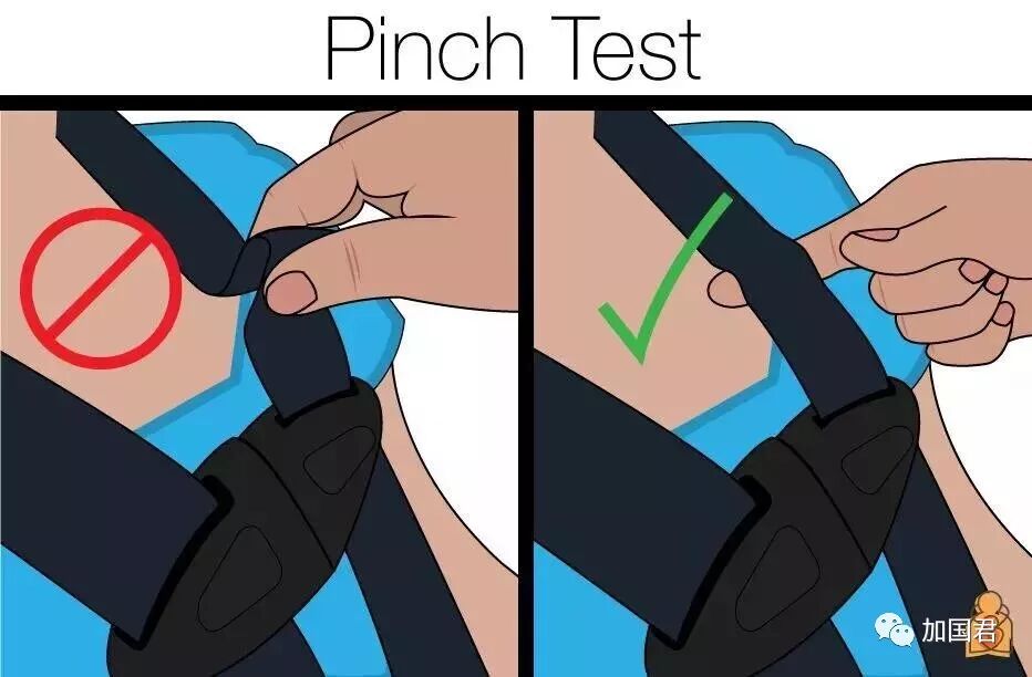 步骤1:让小孩穿上外套,坐在汽车座椅上,系好安全带。 拧紧安全座椅背带(Harness),直到缝隙小于拇指和食指两个手指的宽度。