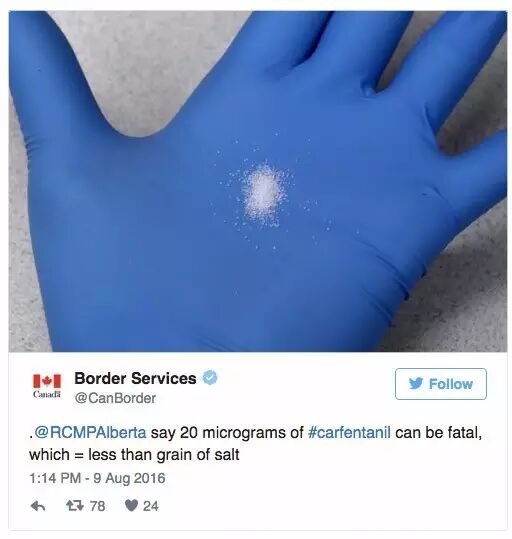 加拿大边境服务处的“官微”表示,卡芬太尼(Carfentanil)20微克就足以致命,20微克什么概念,比一粒食盐还小!!!!
