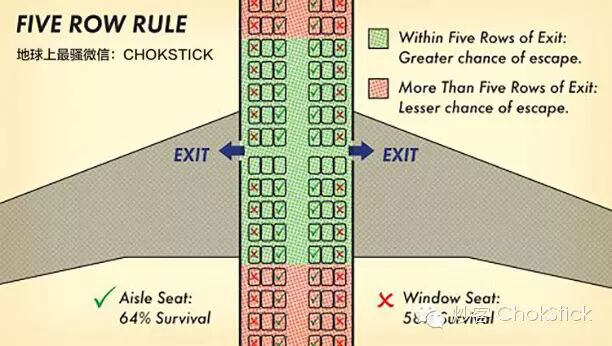 飞机上的位置也决定了逃生的几率。一般来说尽可能坐在靠近出口的地方,据多项数据统计,离紧急出口最近的五排幸存率最高,另外,坐在走廊的位置生存几率也比坐在窗口的高。