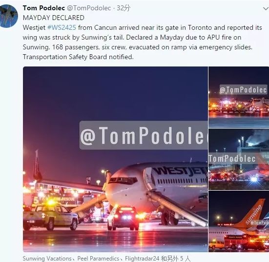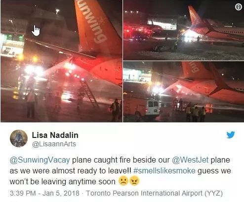 随后,西捷航空公司(WestJet Airlines)在网上发推特表示,事发当时Sunwing的飞机正从门口倒车,不巧撞上了一架抵达西捷航空的飞机,引发火灾。目前,消防员已经将其扑灭,乘客全部安全撤离。