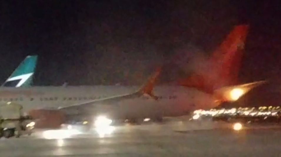 发生碰撞的是一架加拿大太阳之翼航空公司(Sunwing Airlines)和一架西捷航空公司(Wesjet)的飞机。其中一架飞机机翼撞上了另一架飞机的机尾。现场当时火光四射!两部飞机的紧急逃生滑梯弹出。