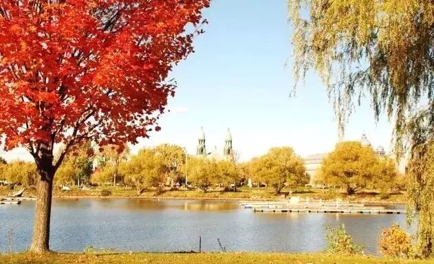 秋天,红红的枫树映照着教堂和“中国运河”。