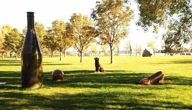 大片大片的草地,养眼的绿色。酒瓶子(男人),皮球小狗(孩子),高跟鞋(女人)象征一个和睦的家庭来此游玩。