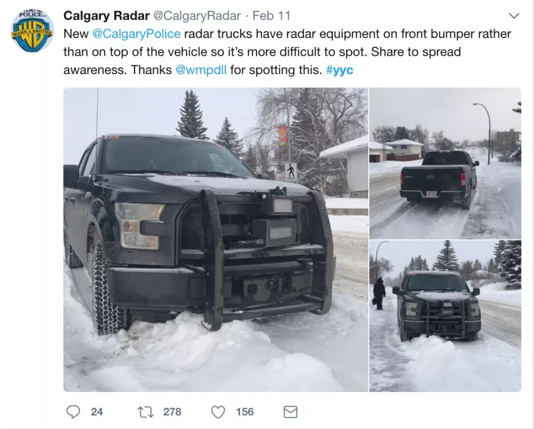 但是,现在卡尔加里警方升级了最新的雷达测速装备,设备再也不是顶车顶上让你警惕了!而是搁车前保险杠上了!↓