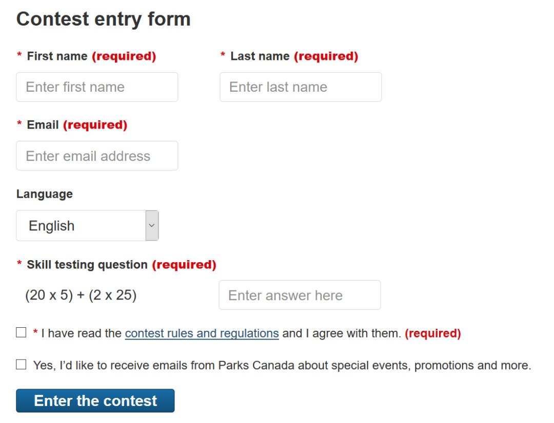参加这个加拿大政府组织的抽奖超简单,只需要登陆Parks Canada官网:http://www.parkscanadacontest.ca/ (或者点击“阅读原文”)