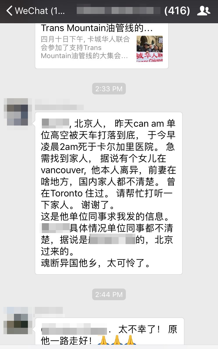 为了迅速帮忙找到亲友,卡城华人小伙伴们动起来了!各路网友开始八方联络熟人,在各个朋友圈,微信群里全方位搜索,卡城华人联合会也鼎力相助,在各个群里发帖找亲人,希望能找到前妻和女儿的蛛丝马迹。