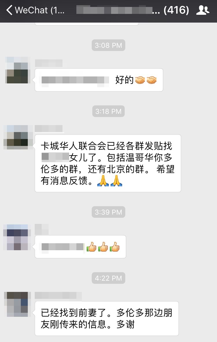 终于功夫不负有心人,经过不到两小时的传播,多伦多那边的华人传过来消息,前妻已经找到了!相信很快,女儿也能联络到!