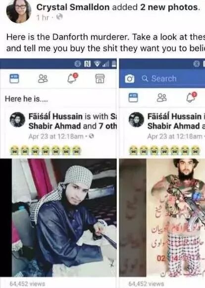 然而昨天,枪手被爆出有伊斯兰背景,曾在社交媒体上公开支持ISIS。下图是脸书网友曝光的枪手FB账号和与枪手发的巴基斯坦一位恐怖份子的照片(但是,现在已经查不到记录了。)
