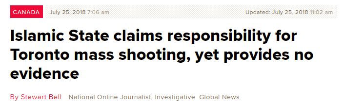 不过,对于ISIS宣称对多伦多此次惨剧负责的消息,多伦多的各大主流英文媒体是怎么报道的呢?