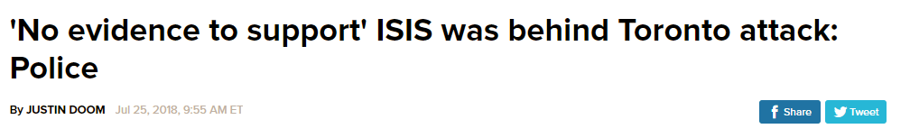 于是,最先爆料者之一,abc NEWS的同一个记者 JUSTIN DOOM,在3个小时候有追发了一条:多伦多警方表示没有证据支持是ISIS对此次袭击负责。