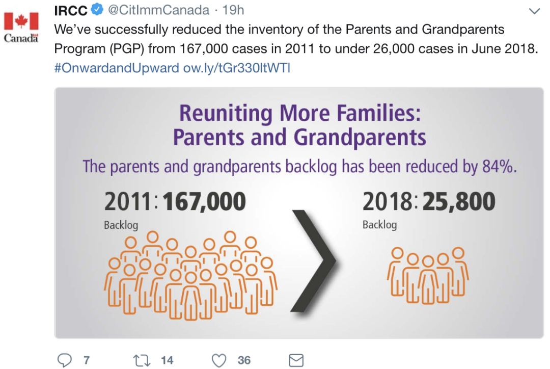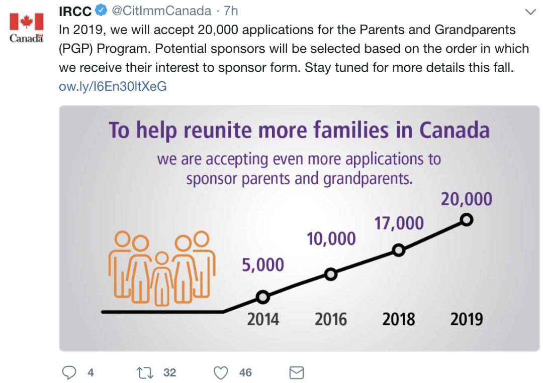 Government will also accept more parent and grandparent sponsorship applications in 2019. The current cap of 17,000 applications will be increased to 20,000 next year.