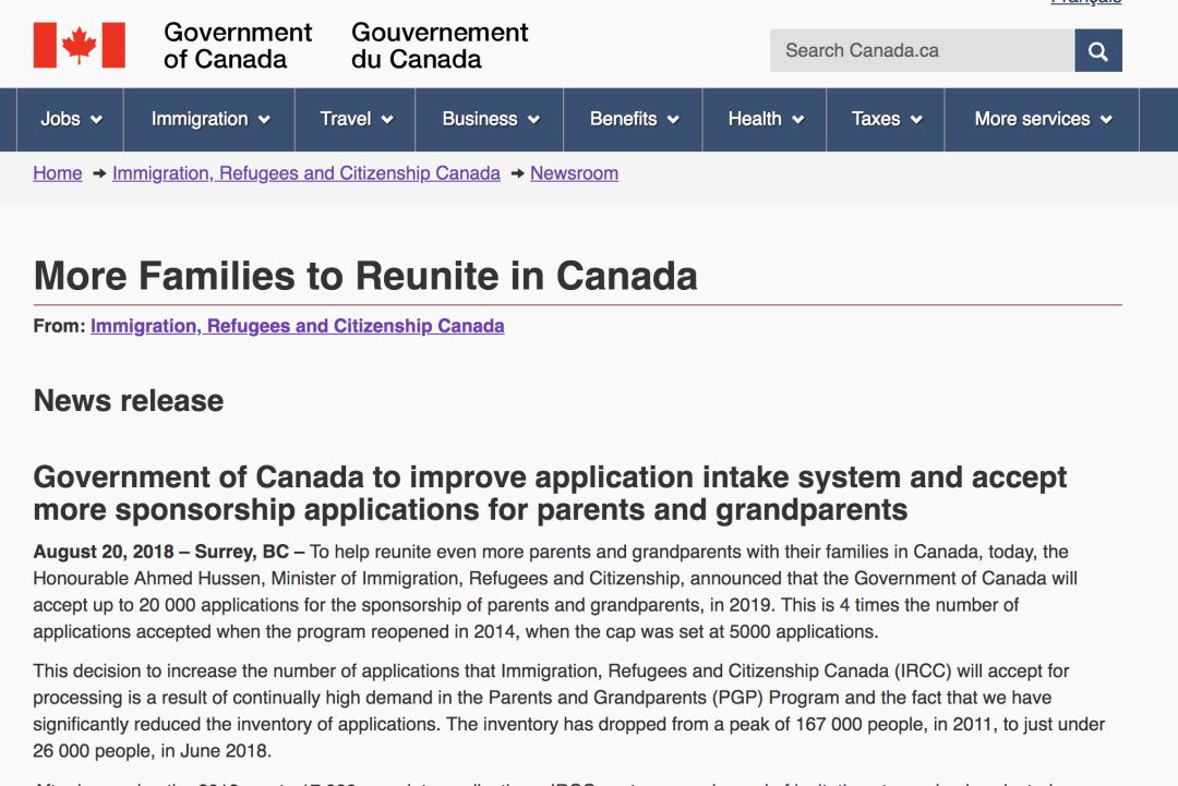 与此同时,2019年起,加拿大政府将接纳更多的父母/祖父母团聚移民,从今年的17000名大增至20000名。