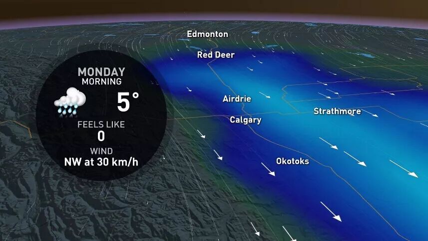 主要原因,是因为突然而来的一股怪异旋风气流。太平洋上的强烈暖气流沿着落基山往东北方向挤压,将冷气流挤压到了阿省西南部,导致了阿省落基山沿线温度骤降,引发大范围降雪。