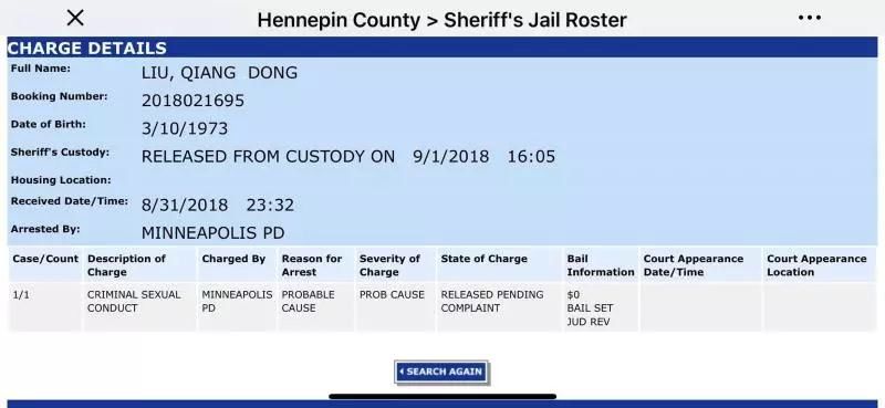 报道说,根据当地亨内平县警长办公室的监狱名单,京东创始人刘强东(Richard Liu)上周五晚间被明尼阿波利斯警方拘留,周六下午获释。