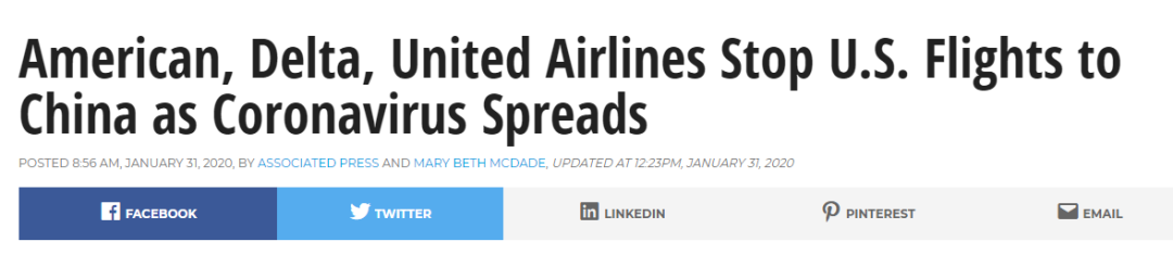 美西当地时间1月31日,据KTLA新闻报道,3家美国航司已经宣布: