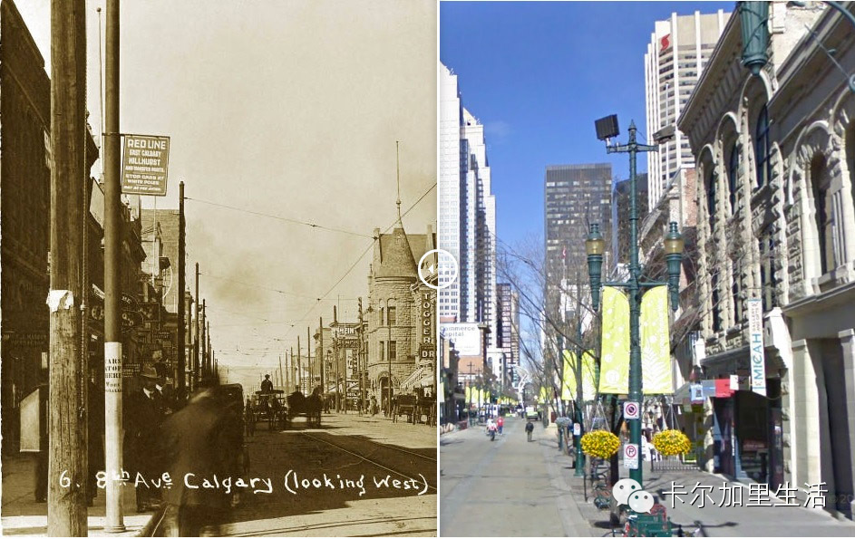左边这张老照片摄于1910年的Stephen Avenue的北端,Stephen Avenue以BMO的老大和第一届泛太平洋铁路主席Baron George Mount Stephen命名的。后来在数字命名街道运动中改城第8大道,经过100余年的发展,它已经成了卡城城市主干道和商业中心。