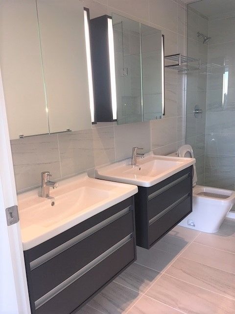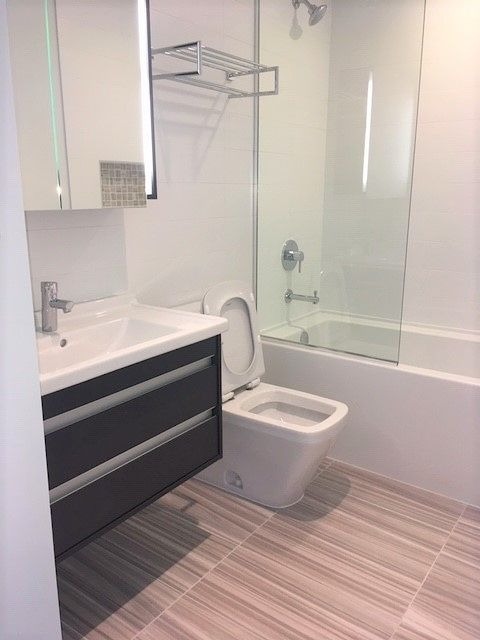 Spacious 2 bed 2 bath with 990 sqft. Floor to ceiling windows with roller blinds in the living room and bed rooms. Starting in the living room you will have access to the full size balcony by three separate doors (access from living room, kitchen and master bedroom). Open concept design featuring a large island, ample cabinet/cupboard space and brand new Stainless Steel appliances including gas stove, fridge/freezer, dishwasher, and microwave. The master bedroom with walk in closet, en-suite shower with double sinks and heat controlled tile flooring.