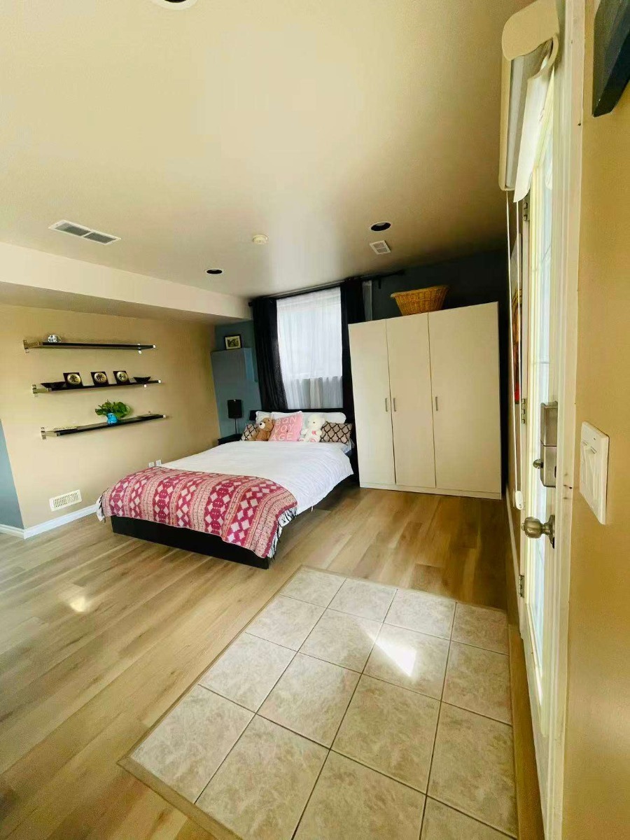 室内配queen size木床、床垫、三门衣柜、冰箱、电磁炉、微波炉、床头柜、电视、电视柜、沙发桌End table、真皮沙发、窗帘、台灯、专用卫浴间,非常明亮、安静洁净舒适。