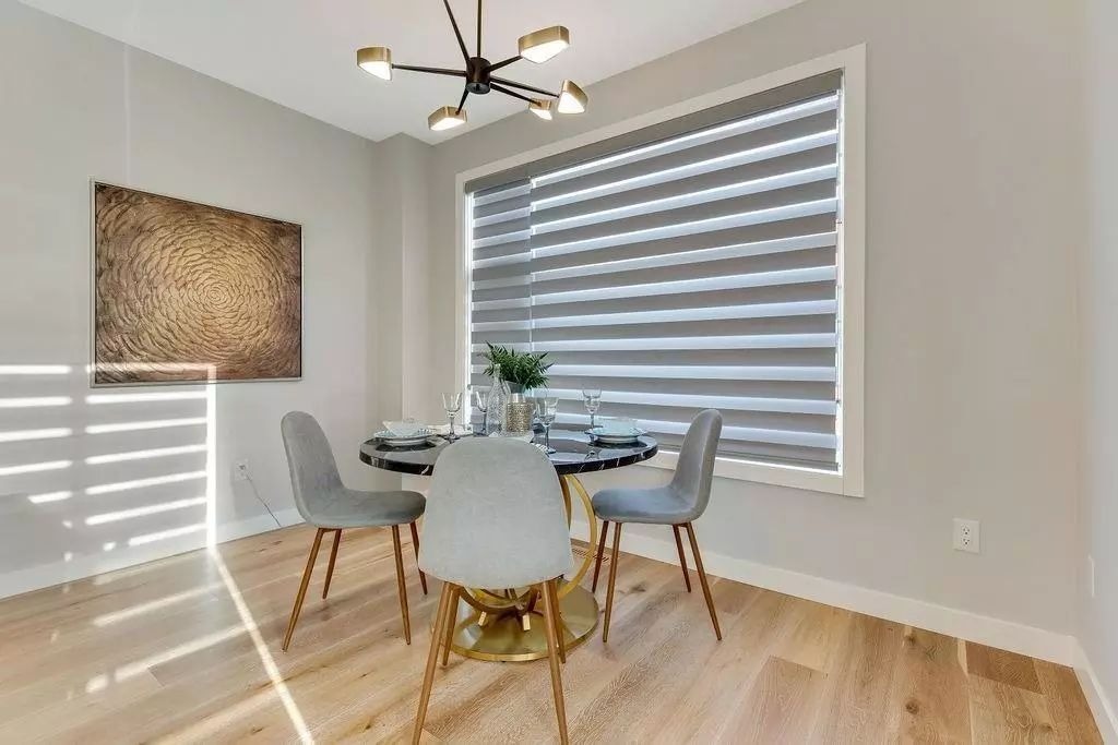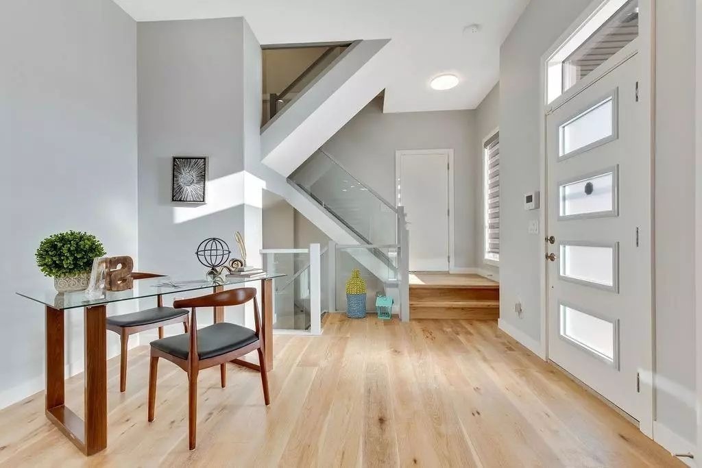 另外一套更贴近现在比较流行的灰色系,不过小编跟青睐样板房的这款。 特别是地板的选择,简约且有很强的纹理质感,非常符合现代的审美观,而且让整个房屋充满了家的温暖。 这套样板房整个楼盘的最具吸引力的一套(据说已经售出了~嘤嘤嘤),整体的装修设计令人非常舒适,小编非常喜欢,要不是因为穷,就差点掏支票本了! 一楼是宽敞舒适的会客厅和办公空间↓ 整体的空间设计以浅灰色为主,搭配木色、金色元素的地板和家具,现代简约又不失温暖。 看的出来,这位负责搭配的室内设计师功力深厚,眼光独到。 二楼是厨房+一间带独立卫生间的卧室。 这个卫生间也可以作为公用卫生间,也可以当做二楼卧室的套内洗手间。 进入二楼房间内,有三扇窗户,采光非常好,在这里住着心情不好都不行。 二楼的洗衣房,干净简约↓ 厨房和餐厅,符合华人生活习惯的大吸力油烟机,双开门冰箱↓ 金属、大理石材质的家具搭配让整个空间不单调↓ 三楼是另外两个带独立卫生间的套间,挑高天花板让空间格外宽敞。 主卧还有一个独立小阳台,夏天可以坐在外面欣赏卡尔加里的城市夜色,这样的生活怎能不爱? 整个房屋的三间卧室都有独立卫生间简直太贴心了,家里如果有三代人同住,每个人都有私密空间,做到家庭和睦相处。 三间卧室都非常宽敞,几乎看不出来有主次之分,所以几代人住完全没问题↓ 住在这样的房子里,才有闲情逸致享受生活~ 四楼是一个大的楼梯间和户外阳台,能够远眺Downtown的天际线,有一览众山小的感觉。 除了楼上四层,还有宽敞明亮的地下室空间,虽然是地下室,但是高挑窗的设计让整个空间一点也不局促。把这里打造成娱乐、游戏空间是极好的! 房源特色: 玉园--The Jade 小区建成效果图如上 价 格 44.5万加币起 (Starting from 445K) 地 址 408 27 Ave NE (Edmonton Trail 与 27 Ave交界处) 交 通 临近交通要道 Highway #1 (16 Ave, 东西向),与 Highway#2(Deerfoot Trail,南北向) 小区楼下有4路和5路公交,直达市中心 距离机场10分钟车程 5分钟车程抵达临近中国超市、餐厅、Safeway以及Co-op超市 距离卡尔加里大学和SAIT约7-10分钟车程 步行距离可到未来规划的轻轨28Ave站 社 区