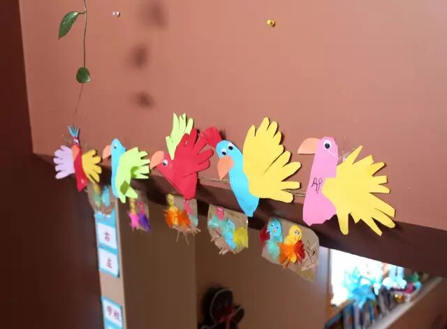 墙上贴着孩子们制作的形态各异的小鸟(上图)