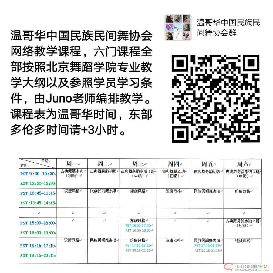 温哥华中国民族民间舞协会开始推出网上授课系统,方便各位同学们继续学习舞蹈。新开设的网课共推出六门课程,方便同学们根据自己的时间来灵活选择喜欢的课程。 选课和报名说明:六门课程ABCDEF分别设置在周一至周六,每天早上两节课,下午两节课。举例:周一四为AB,周二五为CD,周三六为EF,上午和下午是重复的课,大家根据自己的时间来选择。在选择课程的时候没有要求,但如选一门A课,那么建议大家上足周一和四一共两节的A课,因为是连接的课程,掉课会漏学东西,此次类推其它的课程。费用:$12/节/60分钟,因考虑到网课的特殊性,按周来计算,需每周末报名下周的课,任何一个时段满4人以上可开课,并不设延期,结转,每周过完清零。