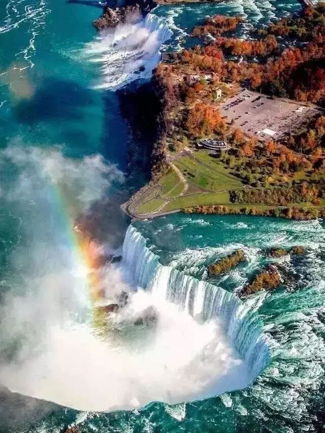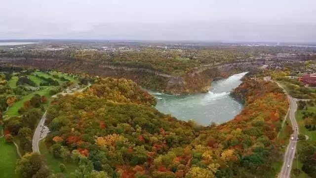 从高空俯瞰尼亚加拉大瀑布,火红色、金黄色、翠绿色、各种颜色相互映衬,秋景醉了人心。