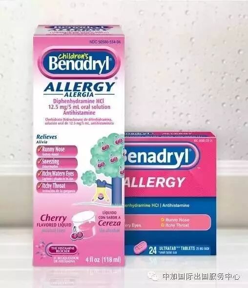 推荐品牌:Benadryl 一款缓解打喷嚏、流鼻涕、喉咙发痒、眼睛发痒等症状的抗过敏药。也可以于一般性过敏引起的荨麻疹和皮肤瘙痒症状,也可用于预防晕车、晕船等。副作用:服用后多困乏嗜睡。