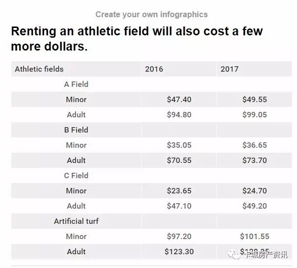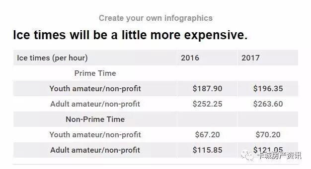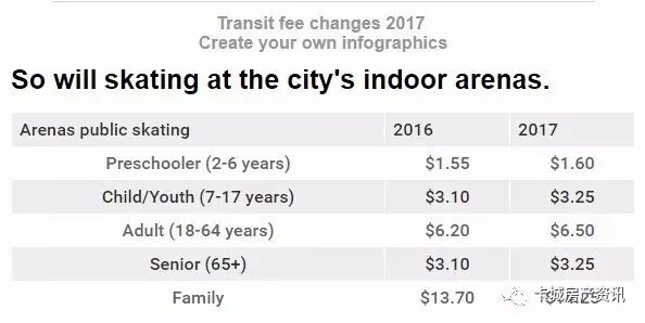 室内溜冰场费用也有所上涨,成年人单票价由6.2涨到6.5加币,未成年人(7-17岁)票价由3.1涨到3.25加币;儿童票价由1.55涨到1.6加币。具体如下: