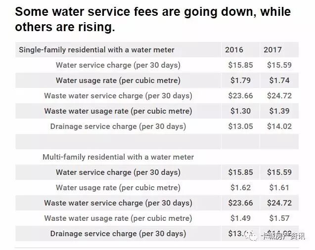 水费也有所变化:用水每立方米费1.79下降至1.74加币,但污水处理费由1.3上涨到1.39,排水费也由13.05上涨至14.02每月: