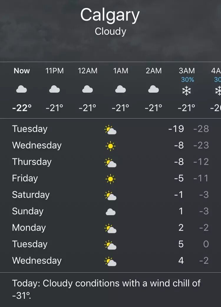从周三起,我们尊敬的“季风大人”就要来了!!TA会将卡尔加里的温度从零下30多度一路拉到零上啊!!!(下图)