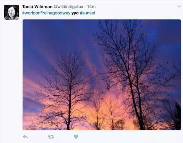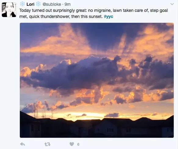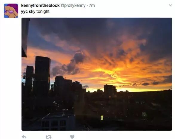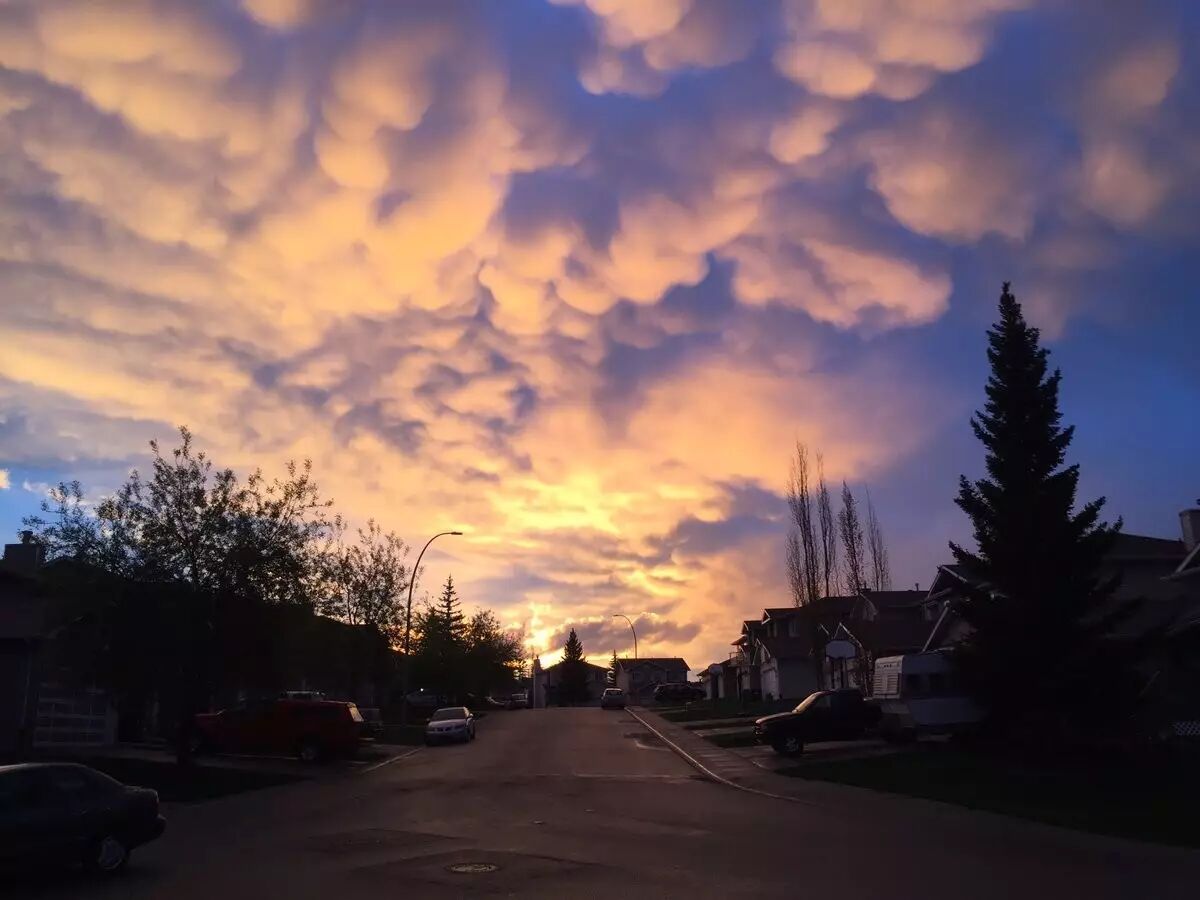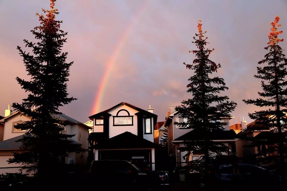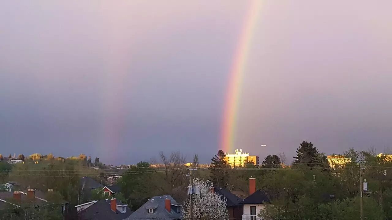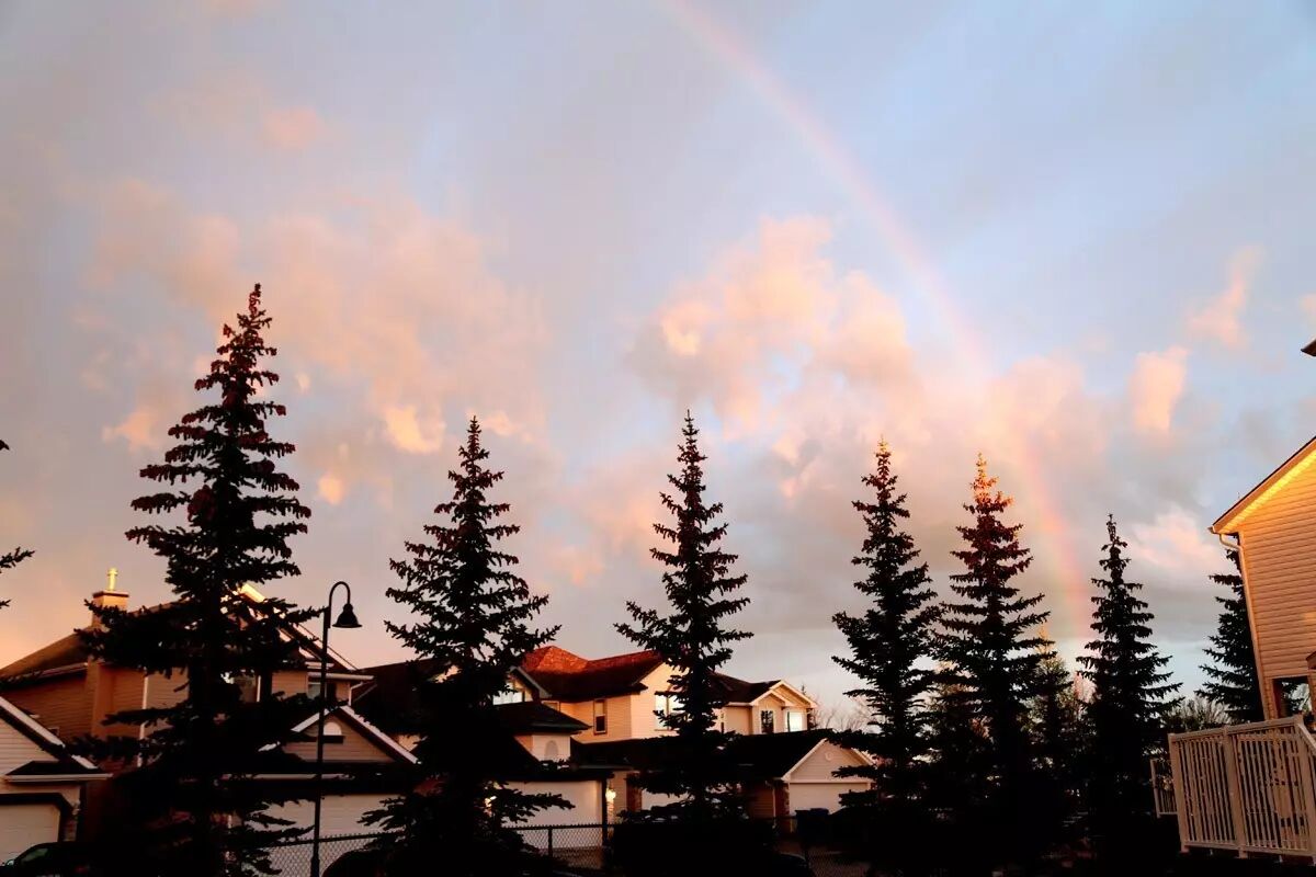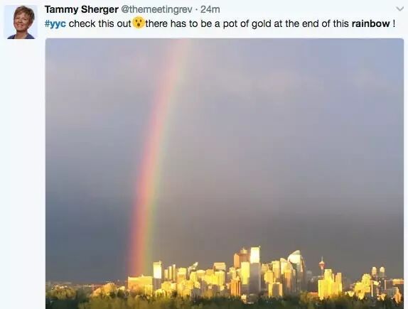 当时云是笼罩在卡城上空的,所以一道彩虹是直接映照在卡尔加里正上空,显得格外壮观(下图)